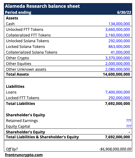 My best guess based on all available data is Alameda’s balance sheet looks like this: $14 billion of “assets” against $8 billion of known debt and $6.9 billion of unknown debt. I doubt Alameda has $6.9 billion of retained earnings or equity on its balance sheet, it is best case an accumulated deficit. Something is wrong.