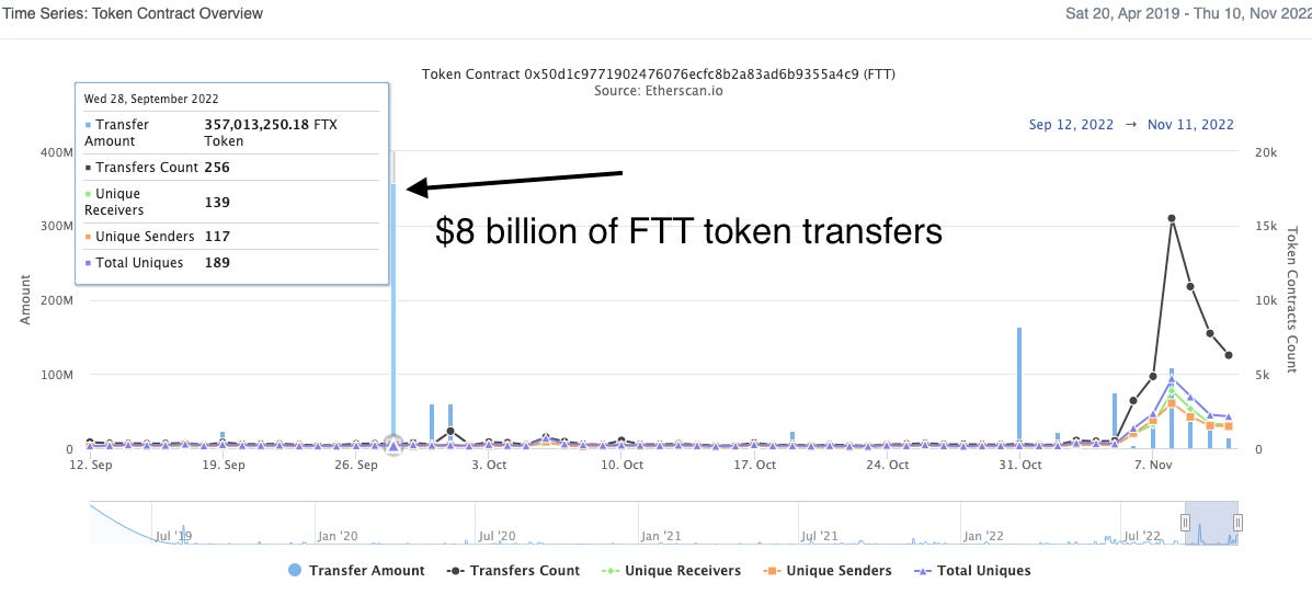 That same day over $8 billion USD of FTT tokens were transferred on chain; the single largest move in the history of FTX.
