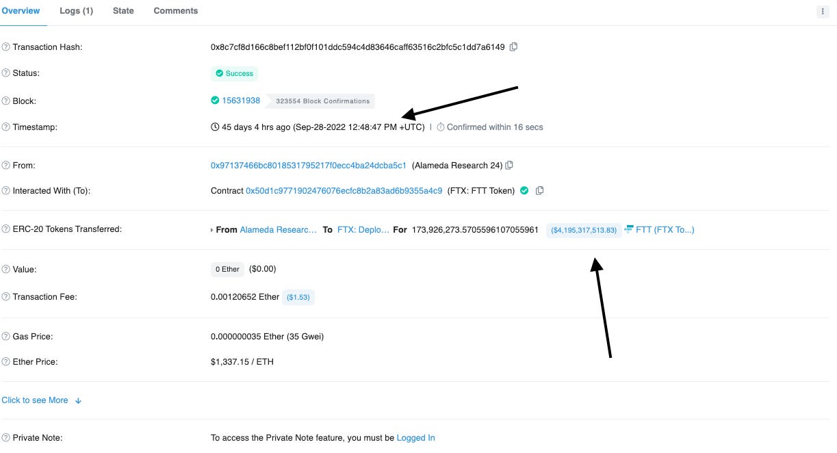 $4.1 billion dollars of FTT tokens were sent from Alameda Research back to the deployer of the FTT token on 9/26 12:48PM UTC